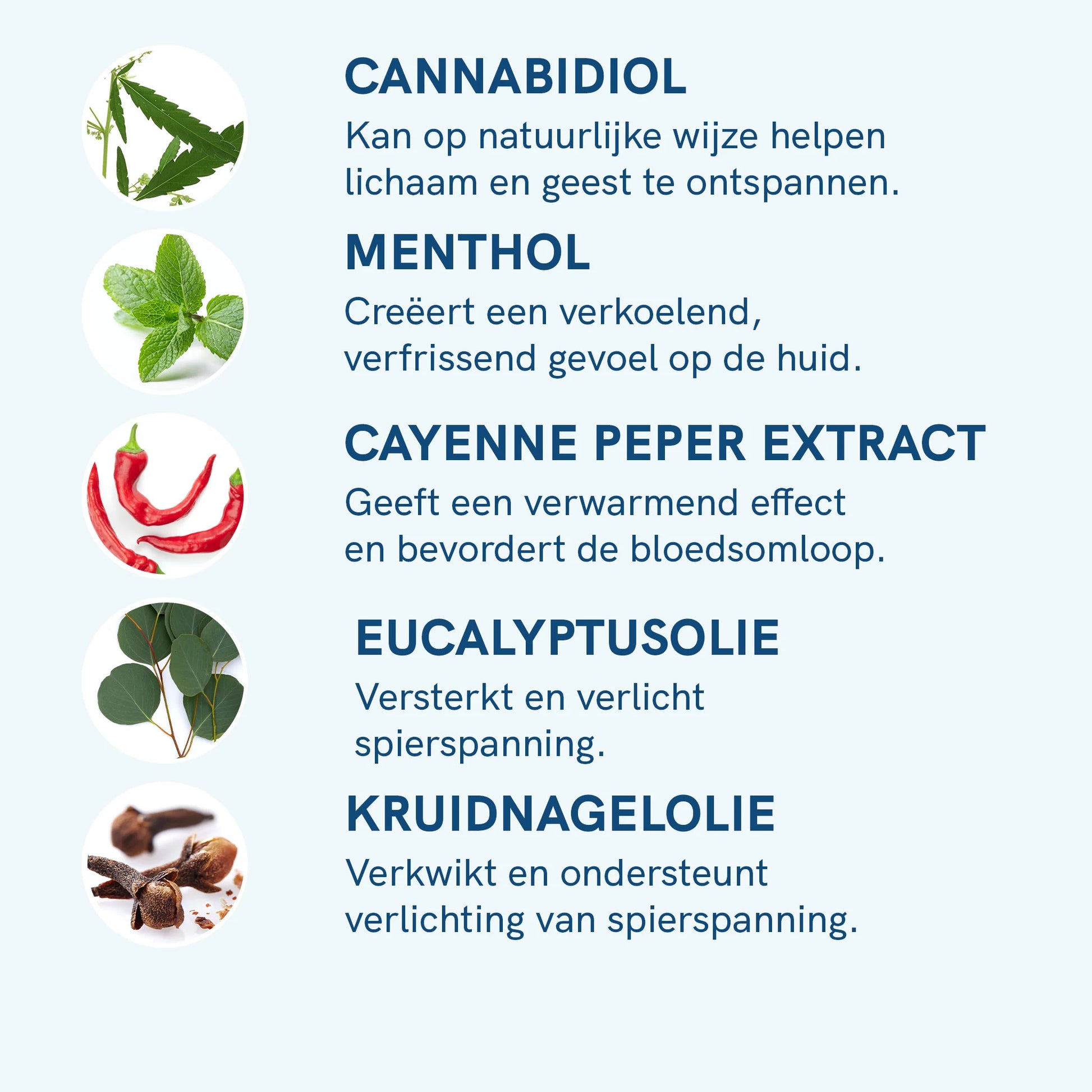 Aqua, Alcohol Denat., Lecithin, Glycerin, Palmitamide MEA (PEA), Beta-Caryophyllene (Cannabis terpene), Carbomer, Sodium Hydroxide, Cannabidiol (CBD), Melaleuca Leucadendron Cajaput Oil, Rosmarinus Officinalis (Rosemary) Leaf Oil